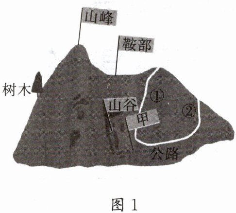 (2)题,当把水注入装有山体模型的塑料盒时,水流会汇集到山谷。第
