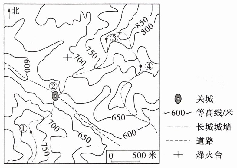 5.C 6.B 解析 第5题,烽火台海拔为650—700米,海拔不是图中最高;关城位于鞍部,没有四面环山;城墙沿线多为等高线向低处凸出的地方,为山脊,防御功能强;道路沿山谷建设,坡度较缓,修建难度较低。第6题,①到②的等高线较②到③的等高线密集,坡度较大,②到③的等高线更稀疏,坡度更小;根据指向标可知,③在④的西北方向;读图可知,①和②的图上距离约为1.5厘米,根据比例尺,①和②的实地距离约为750米;③海拔为800—850米,④海拔为700—750米,故两地相对高度为50—150米。