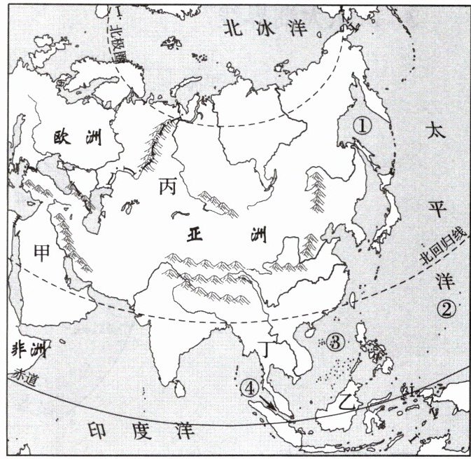 2.B 3.D 4.A 解析 第2题,甲是半岛,乙是岛屿,丙位于亚欧大陆,丁是半岛。第3题,海峡是两块陆地之间连通两个海或洋的水道,图中④所在位置为海峡,是马六甲海峡。第4题,苏伊士运河是亚洲和非洲的分界线,与亚洲和欧洲的分界线无关;亚洲和欧洲的分界线为乌拉尔山脉、乌拉尔河、里海、大高加索山脉、黑海和土耳其海峡。