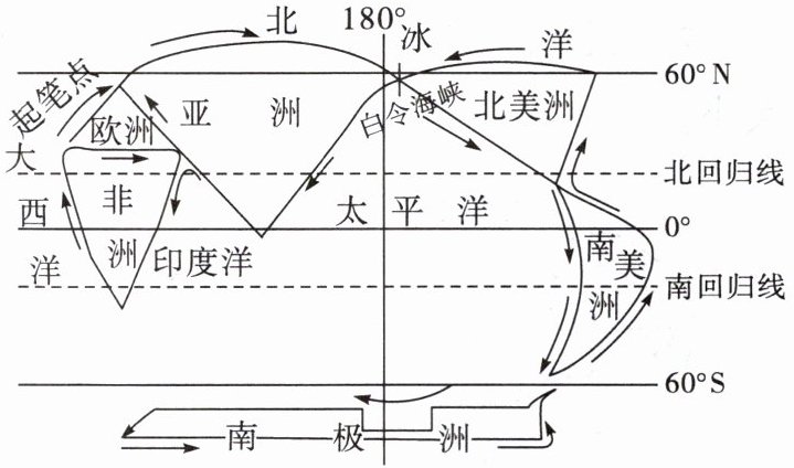 某校同学通过“一笔画世界”活动学习世界的海陆分布。读小顺同学的作品图,完成 5~8 题。
