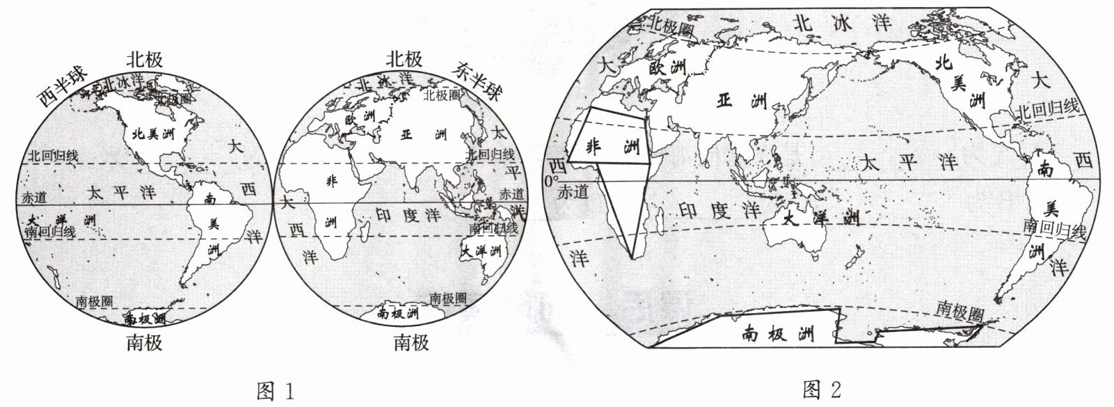(3)地图是我们日常生活和学习地理不可缺少的工具。请在图 2 中仿照非洲、南极洲简图的画法,任选一个大洲,在相应位置绘制其几何轮廓。