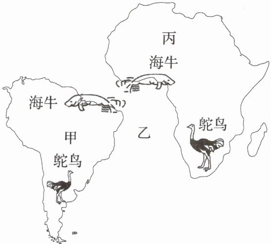 读海牛、鸵鸟在非洲和南美洲的分布图,完成 1~2 题。