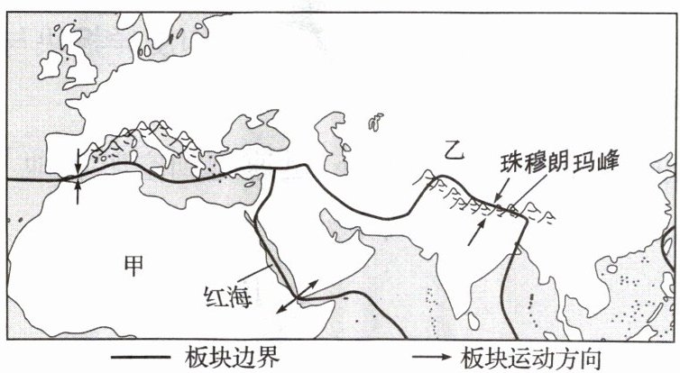 3.C 解析 读图可知,甲是非洲板块,乙是亚欧板块;红海处于两个板块之间的张裂处,红海的面积在不断扩张;珠穆朗玛峰在不断隆升的主要原因是处于亚欧板块和印度洋板块的碰撞挤压处,地壳不断抬升,海拔不断升高。