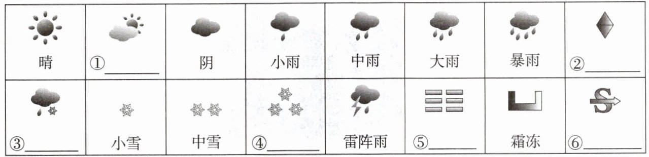 2.①多云 ②冰雹 ③雨夹雪 ④大雪 ⑤雾 ⑥沙尘暴