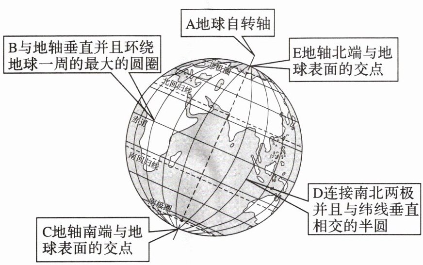 (2)题,连接南北两极的最近“通道”是地轴,在图中是A。第