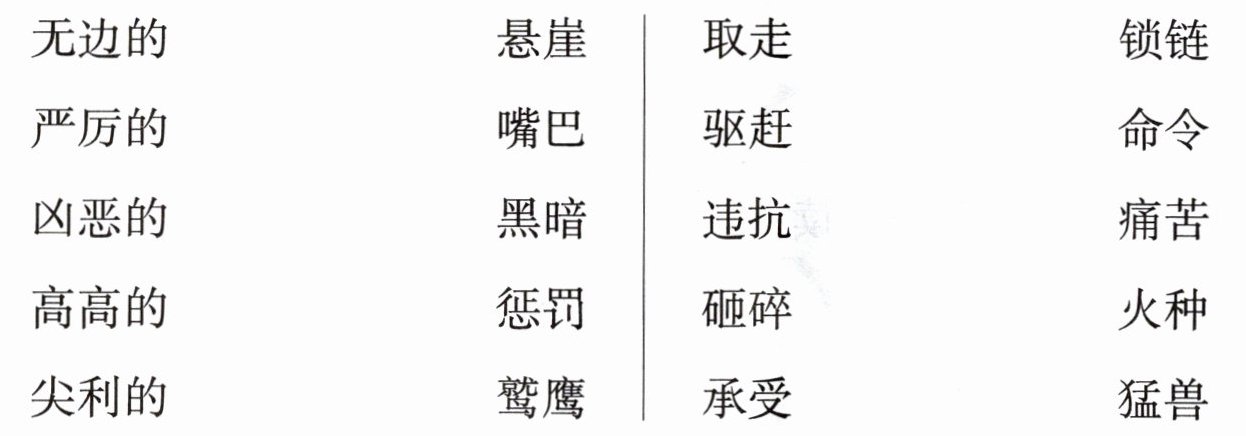 无边的—黑暗 严厉的—惩罚 凶恶的—鹫鹰 高高的—悬崖 尖利的—嘴巴 取走—火种 驱赶—猛兽 违抗—命令 砸碎—锁链 承受—痛苦
