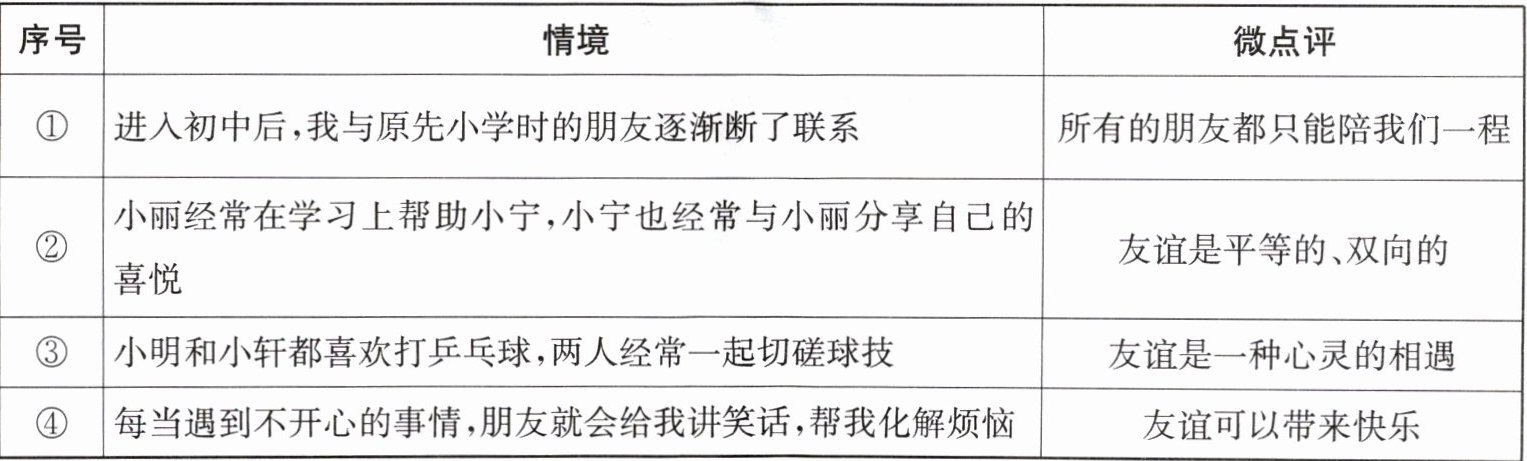 ①在真正的友谊中,我们能够享受快乐和温暖 ②朋友见证了我们一起走过的成长历程 ③友谊离不开物质条件的支撑 ④友谊让我们更深刻地体悟人生的美好