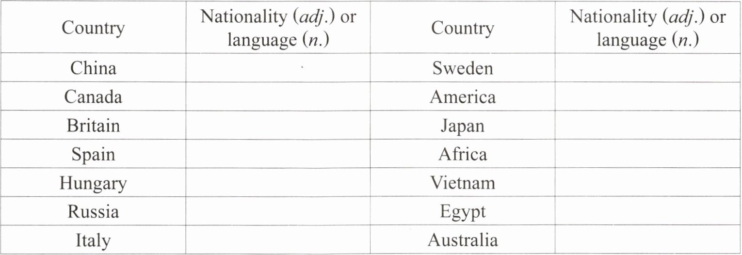 | Country | Nationality (adj.) or language (n.) | Country | Nationality (adj.) or language (n.) |