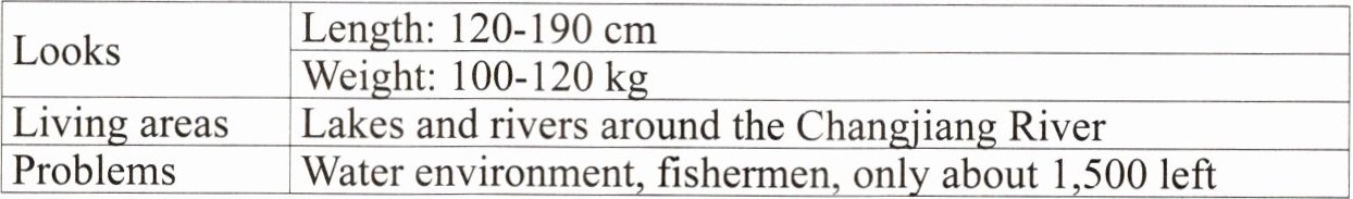 They are 120-190 cm long and weigh 100-120 kg. They live in lakes and rivers around the Changjiang River. However, they face many problems. The water environment is getting worse. Some fishermen's activities also harm them. Now only about 1,500 are left. We must protect them. We should keep the water clean and stop harmful fishing. Let's work together to save these lovely animals.