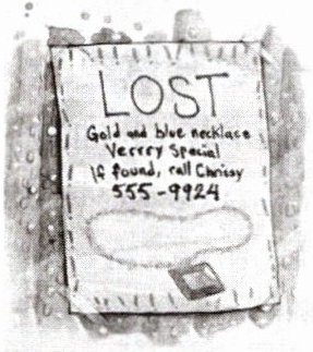 Sam and I walked along the main street, the small buildings giving us a break from the sun. Through the window of the candy shop I could see tubes of colorful jelly beans. A sign on the window's glass read LOST: Gold and blue necklace. Verrry special. If found, call Chrissy at 555 - 9924.