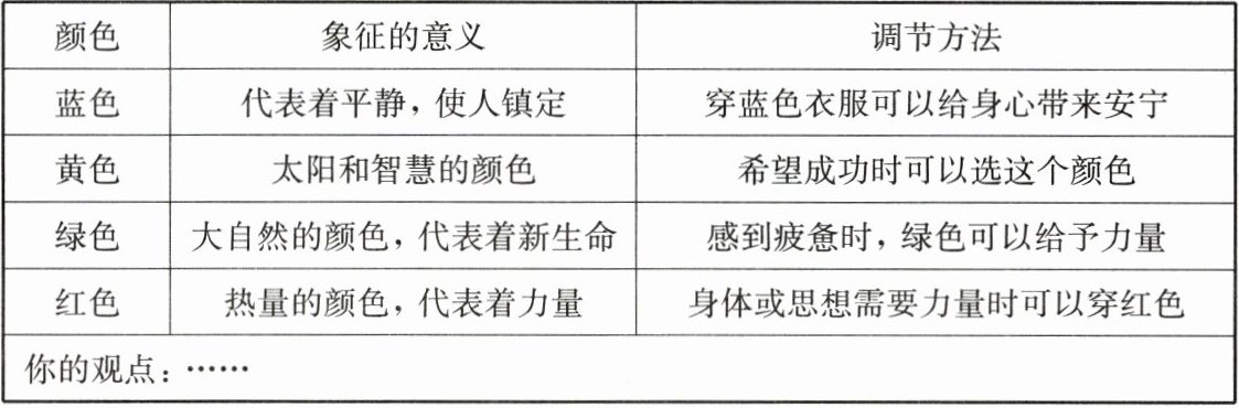 假设上周你听了学校的心理老师关于颜色的讲座,你了解了如何利用颜色调节情绪。请你根据下表提示要点,用英文把这些调节方法写出来和同学们分享。