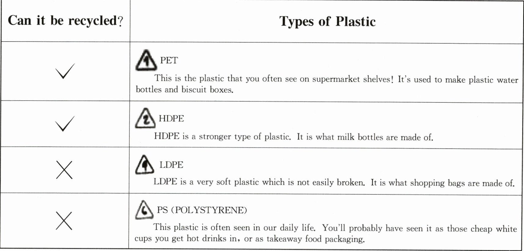 On the bottom of most plastic packaging(包装), there’s a small triangle(三角) with a letter or a number written inside. These little symbols are not easy to be noticed, but are really important. They tell you what kind of plastic it is and whether(是否) it can be recycled or not.