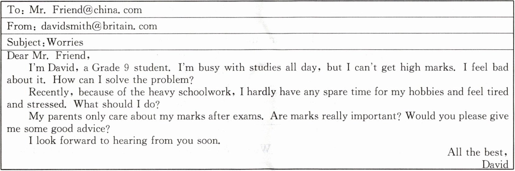 假定你是青少年辅导员Mr. Friend,九年级学生David给你发了一封电子邮件。他向你倾诉了最近他在学习和生活中的一些烦恼。请认真阅读下面的邮件,根据信中的内容及你的实际,用英语给David回一封邮件。