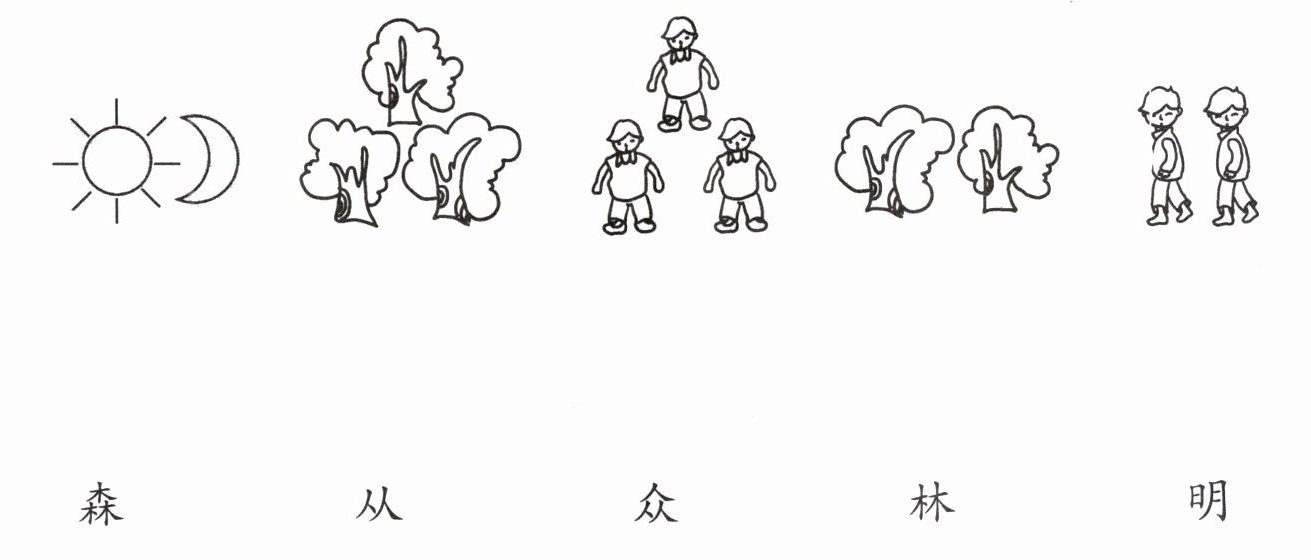 答案: 第一幅图连明,第二幅图连森,第三幅图连众,第四幅图连林,第五幅图连从。