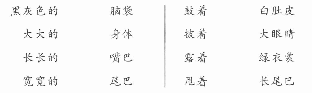 黑灰色的——身体;大大的——脑袋;长长的——尾巴;宽宽的——嘴巴;鼓着——大眼睛;披着——绿衣裳;露着——白肚皮;甩着——长尾巴