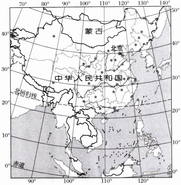 1.D 2.B 3.A 解析 第1题,从地理位置看,我国位于亚洲的东部,太平洋的西岸,没有濒临印度洋。第2题,根据图中纬度判断,我国大部分地区位于北回归线以北,北部未到北极圈,所以我国大部分地区位于北温带,南部部分地区位于热带,没有地区位于寒带。第3题,我国是一个海陆兼备的国家,东部海域广阔。蒙古国是内陆国,不临海。