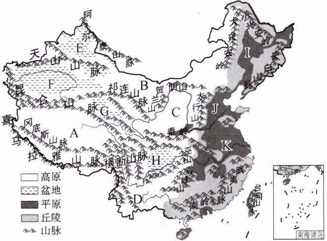 2. 读教科书第 29 页图 2.5,填写下图中字母代表的地形区名称。