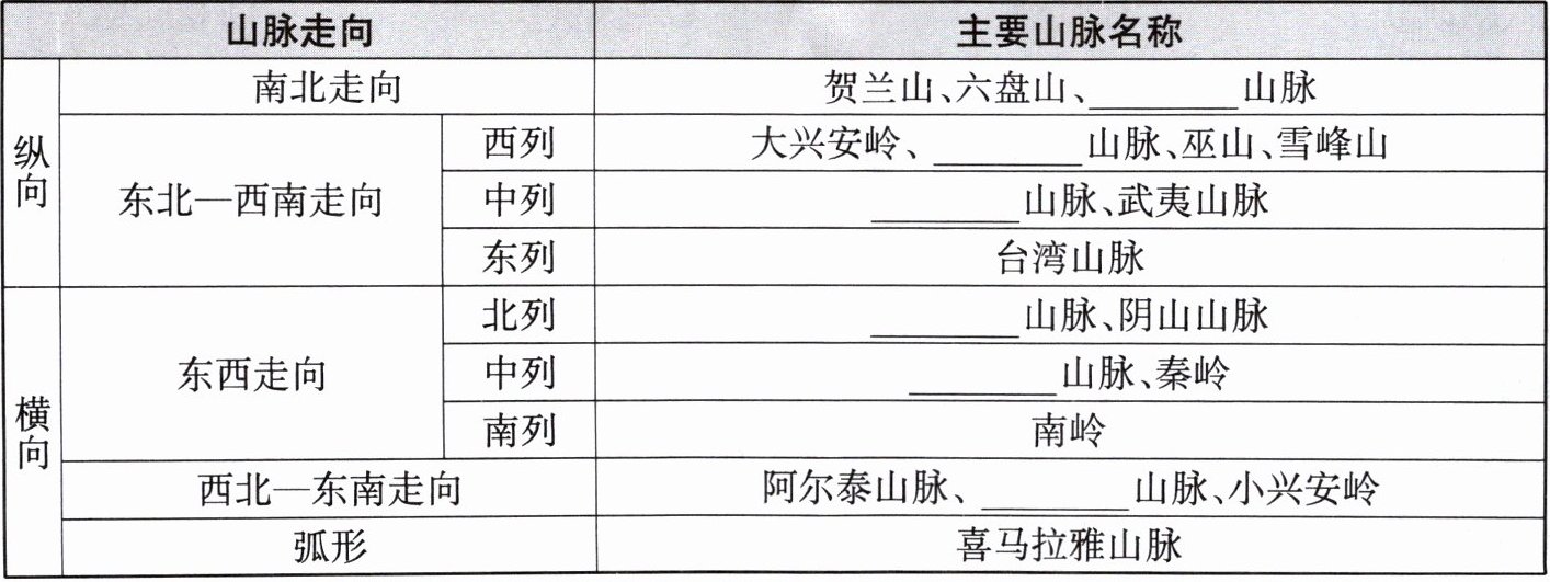 1. 读教科书第 28 页图 2.4,将我国不同走向的山脉填写在下表中。