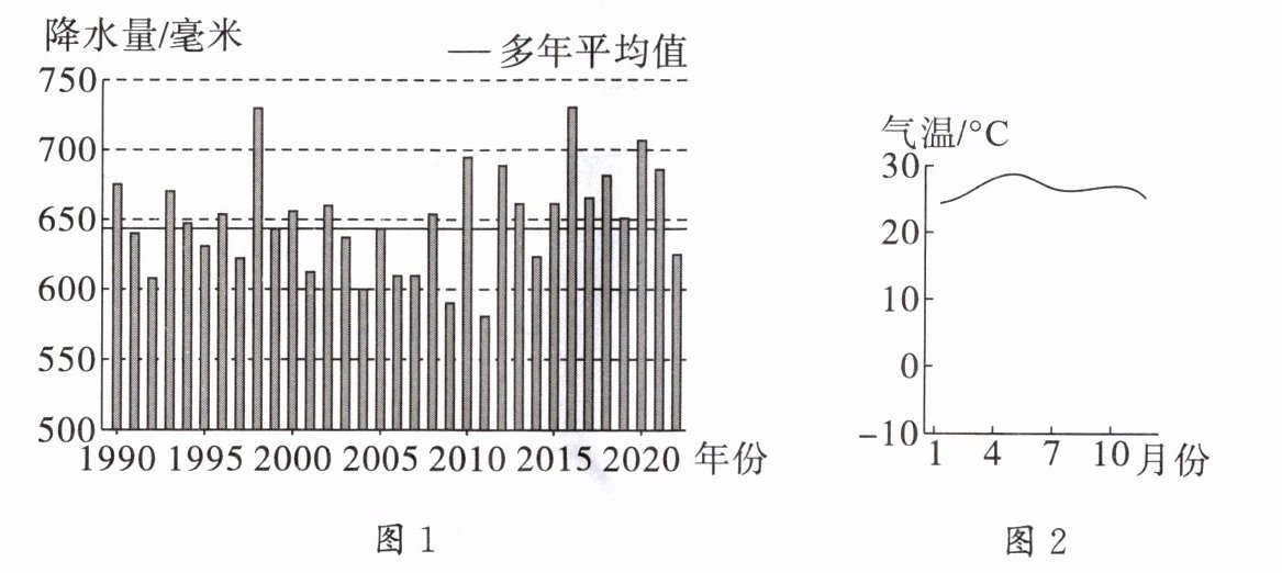 读我国年降水量变化图(图1)和某城市多年平均各月气温图(图2),完成3~4题。