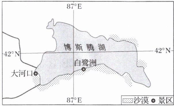 博斯腾湖是我国最大的内陆淡水湖,位于天山山脉中段南缘及塔克拉玛干沙漠北缘。“推冰”是博斯腾湖一道奇特的自然景观,每到冰雪消融,湖面上的冰面破裂,隆起的大量冰块受到风的影响涌向岸边,形成壮观的“推冰”景观。读博斯腾湖简图,完成 7~9 题。