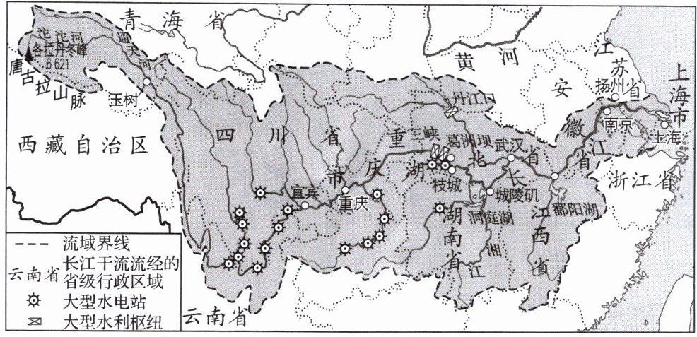 (1)长江上中游干支流的许多河段水位落差很大,蕴藏丰富的水能资源。我国在这些水位落差大的河段进行水能梯级开发,修建了一系列大型水电站。其中,长江干流的梯级水电站构成世界最大的“