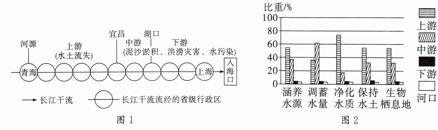 为了实现长江流域的可持续发展,应坚持“生态优先,绿色发展”。读长江干流各河段主要生态环境问题示意图(图1)和长江各河段五种生态功能占比图(图2),完成9~11题。