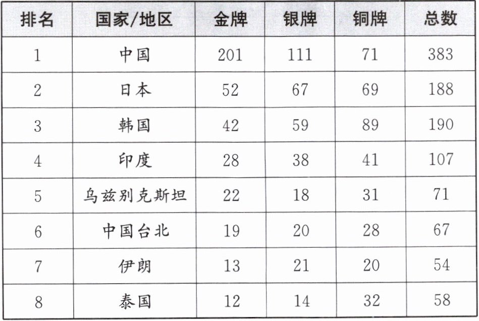 在杭州第19届亚运会中,中国体育代表团获得201金111银71铜,共383枚奖牌,取得亚运会参赛历史最好成绩,位居亚运会金牌榜榜首。下表为本届亚运会奖牌榜(部分),据此完成7~8题。