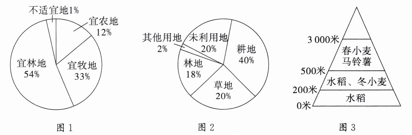 图 1 为我国某地区土地资源构成图,图 2 为该地区土地利用构成图,图 3 为该地区粮食作物垂直分布图。读图,完成 7~8 题。