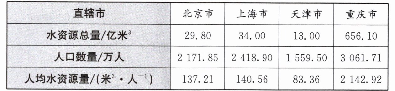 (2024·福建中考)我国四个直辖市的水资源存在差异。下表示意某年四个直辖市的水资源与人口状况。读表,完成 6~7 题。