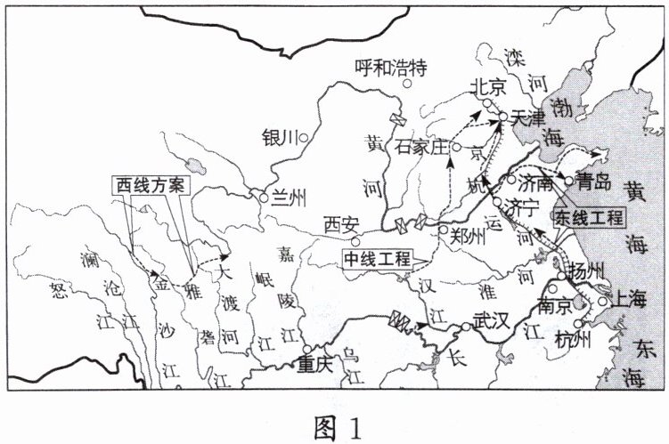 材料一 截至 2024 年 5 月 13 日,南水北调东中线一期工程累计调水 720 亿立方米,沿线 7 省级行政区超 1.76 亿人从中受益。图 1 为南水北调工程线路示意图。