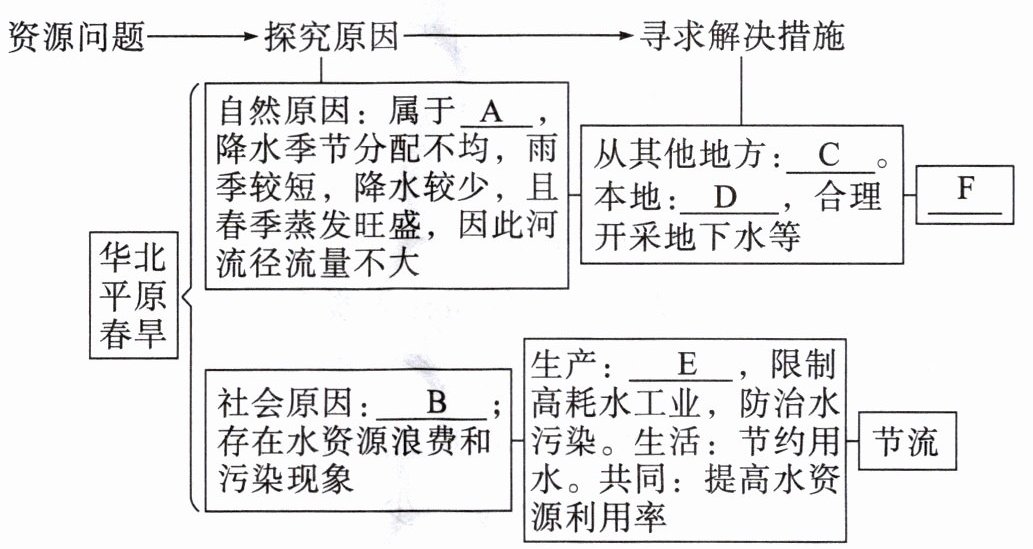 |华北平原春旱|自然原因:属于 A ,降水季节分配不均,雨季较短,降水较少,且春季蒸发旺盛,因此河流径流量不大|从其他地方:C 。本地:D ,合理开采地下水等|F|