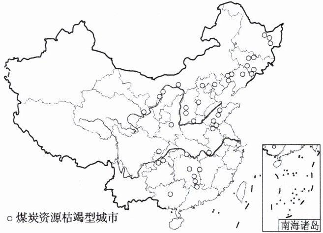 10. (选做题)随着经济的发展和资源的不断开采,我国一些因煤而兴的城市面临着煤炭资源枯竭的问题。通常把因大规模开采自然资源而兴起,并以自然资源的开采和加工工业为主导产业的城市,称为资源型城市。城市所依托的资源在现有技术水平下开采殆尽,或市场对这种资源的需求大幅度减少,城市经济发展趋于缓慢,资源型城市就成为资源枯竭型城市。读我国煤炭资源枯竭型城市的分布(截至 2020 年)图,完成下列各题。