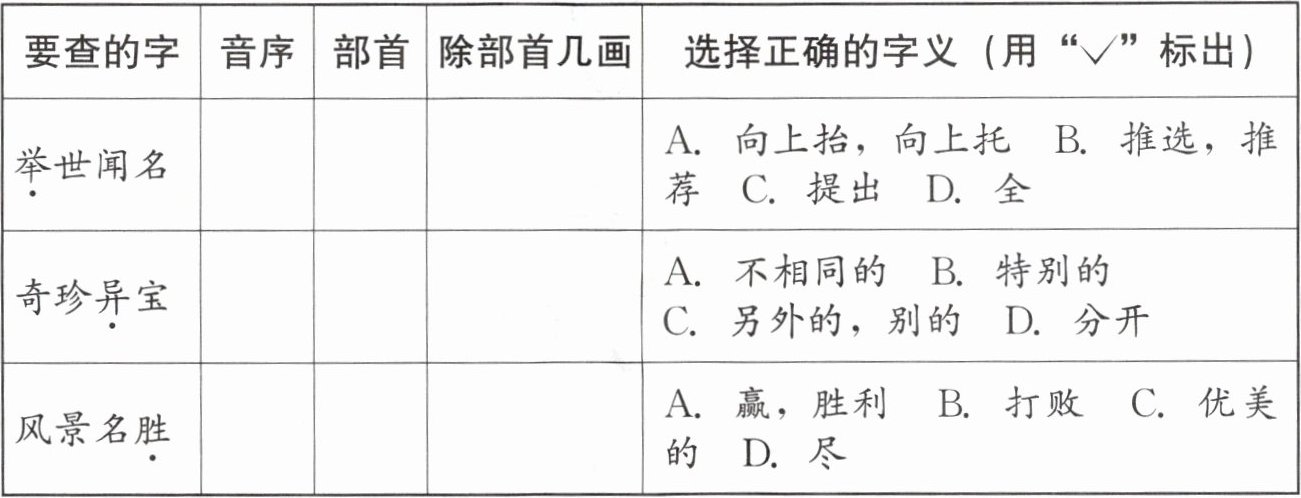 | 要查的字 | 音序 | 部首 | 除部首几画 | 选择正确的字义(用“√”标出) |