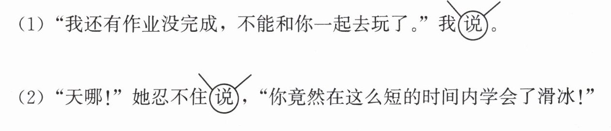 二、写人物说话时,可以不用“说”来表达。按要求完成下面的练习。