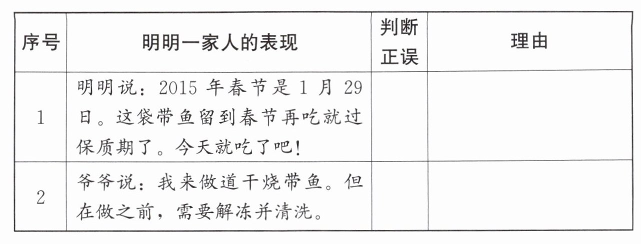 6. 根据下面“国产带鱼”包装袋的说明和短文的相关内容,对表格中明明一家人的表现做出判断(对的画“√”,错的画“×”),并写出理由。