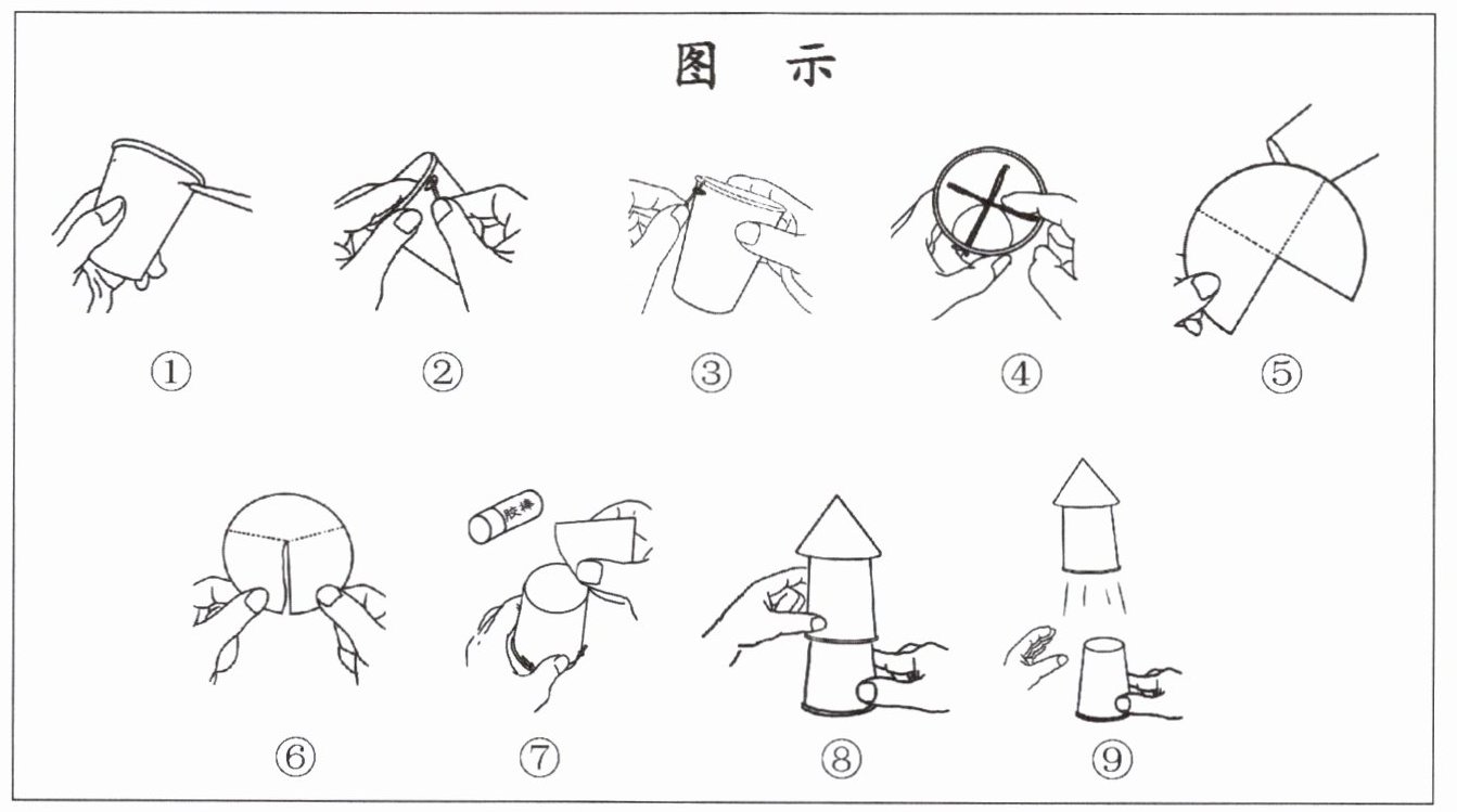任务二:在航天展厅的实践活动中,小凯自主创意,制作完成了一个“纸杯火箭”。为了与同学们分享,小凯写了一份“制作说明”,但他漏掉了一处。请你对照图示,帮小凯将漏掉的部分补写在横线上。