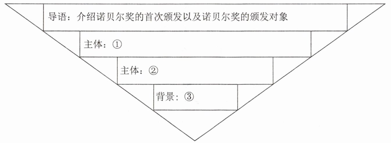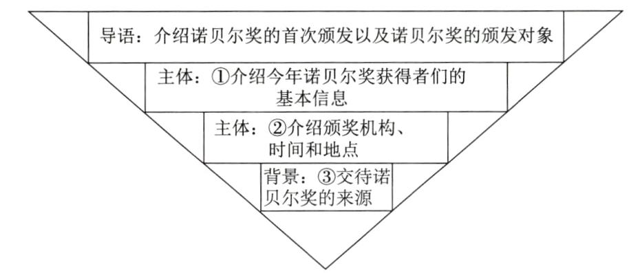 5. 导语:介绍诺贝尔奖的首次颁发以及诺贝尔奖的颁发对象主体:①介绍今年诺贝尔奖获得者们的基本信息主体:②介绍颁奖机构、时间和地点背景:③交待诺贝尔奖的来源