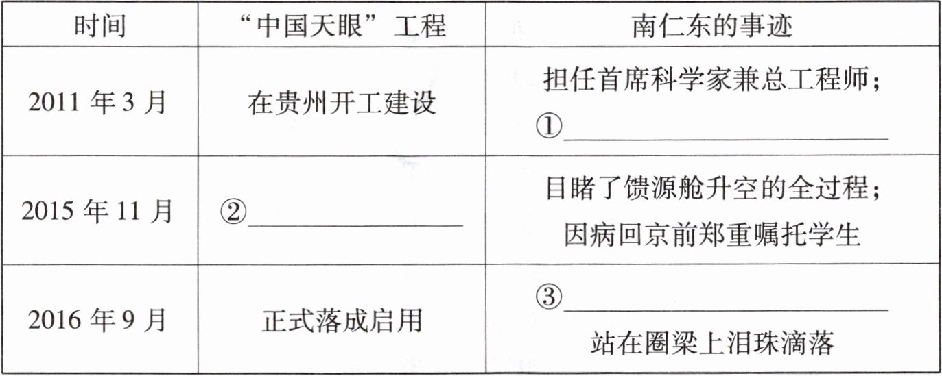 |2015 年 11 月|②______|目睹了馈源舱升空的全过程;因病回京前郑重嘱托学生|