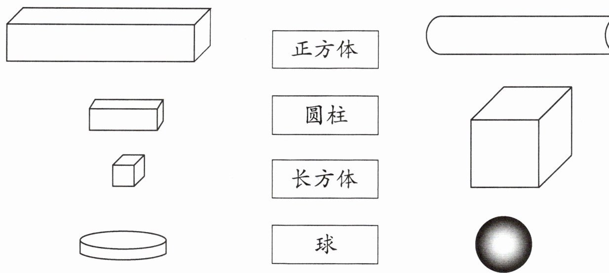 (此处需根据实际插图中图形与名称的对应关系连线,因未提供具体插图,无法给出准确连线结果。实际答题时,应将长方体图形与“长方体”相连,正方体图形与“正方体”相连,圆柱图形与“圆柱”相连,球图形与“球”相连。)