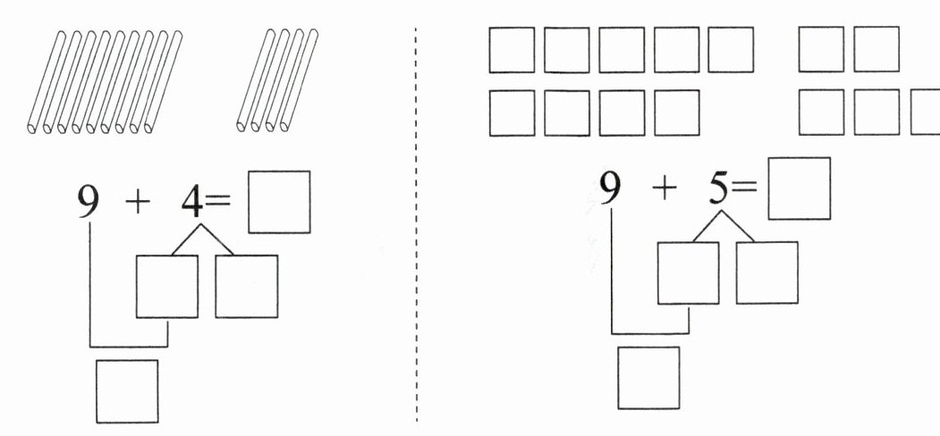 $\begin{matrix}& & 9 & + & 5 & = & □ \\& & \downarrow & & \downarrow & & \\& & □ & & □ & & \end{matrix} & □ \\& & \downarrow & & \downarrow & & \\& & □ & & □ & & $