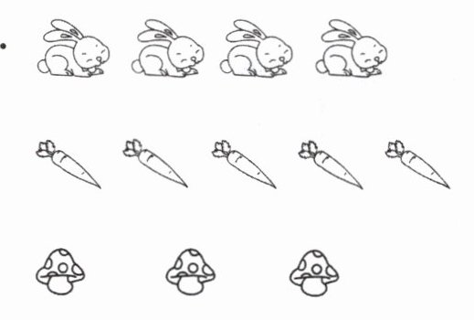 2. 4只兔子,5根胡萝卜,中间符号;3只熊猫,中间符号;熊猫再添几个和兔子一样多,中间符号。