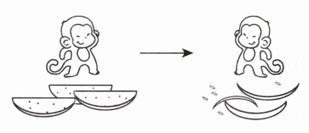 1. 两只猴子,两个西瓜,箭头指向两只猴子在吃西瓜皮。$□◯□=□$(块)