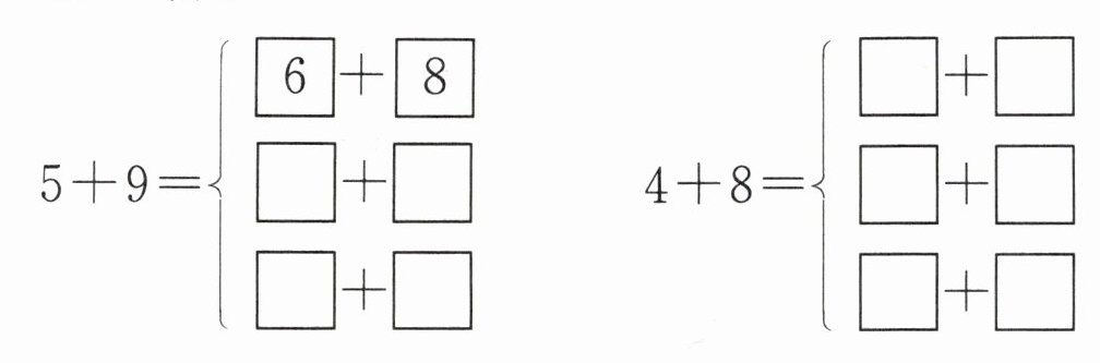 $\end{array}$ $$\right.$$4 + 8 = \left\${ $\begin{array}{l} $□ + □ \\ □ + □ \\ □ + □ $\end{array}$ $