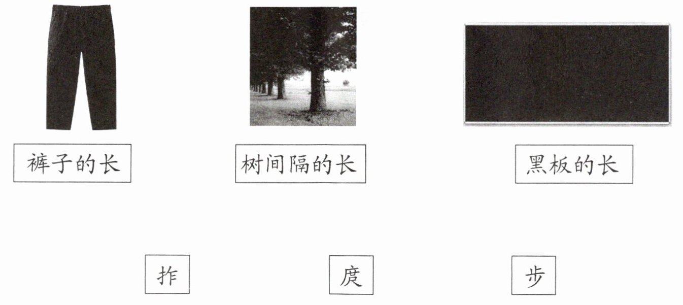 1. 裤子的长用“拃”量,树间隔的长用“步”量,黑板的长用“庹”量。