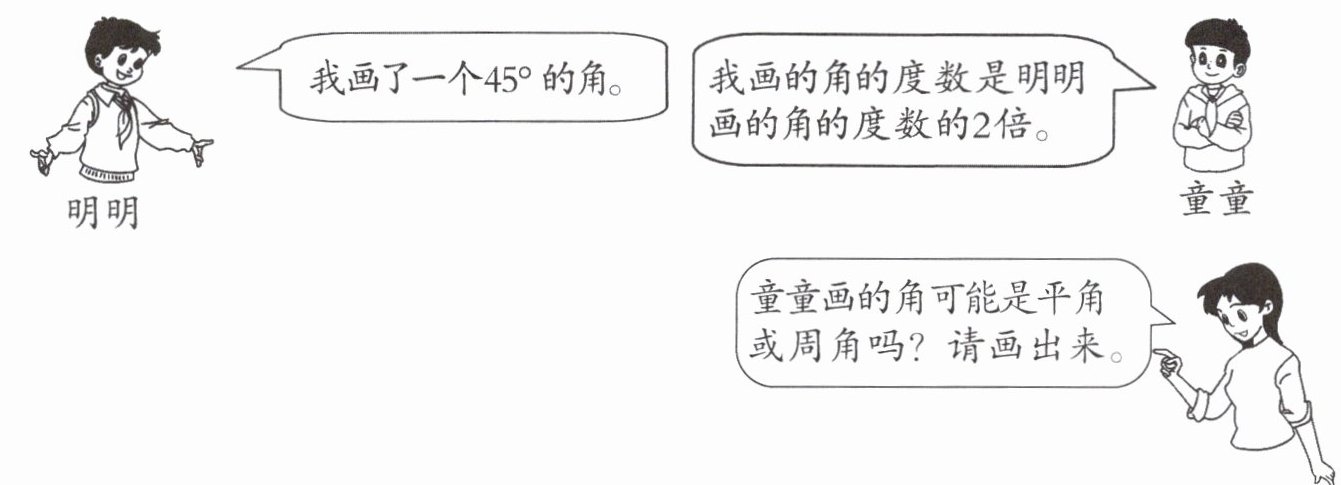 童童画的角的度数:45°×2=90°。平角是180°,周角是360°,90°≠180°且90°≠360°,所以童童画的角不可能是平角或周角。童童画的角是90°的直角,画图如下(此处文字描述画图步骤:先画一条射线,使量角器的中心和射线的端点重合,0°刻度线和射线重合,在量角器90°刻度线的地方点一个点,以画出的射线的端点为端点,通过刚画的点,再画一条射线,标出90°)。