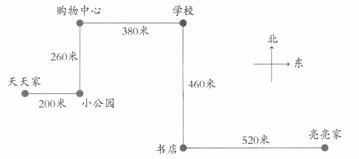 (2) 亮亮从家向____走____米到达书店,再向____走____米到达学校。