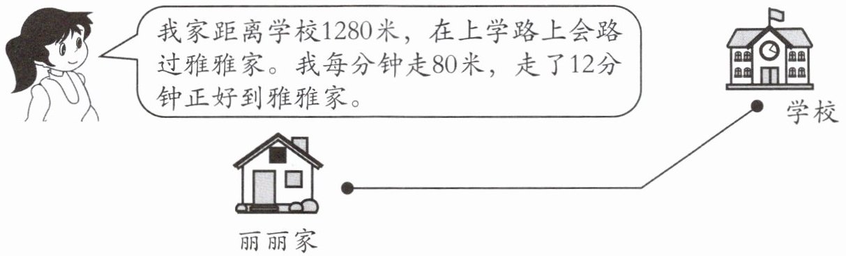 (2) 雅雅家到学校的距离为 $1280 - 960 = 320$ 米,雅雅从家到学校要走 $320 ÷ 64 = 5$ 分钟。