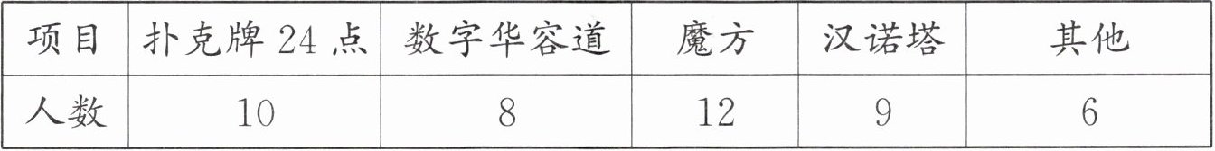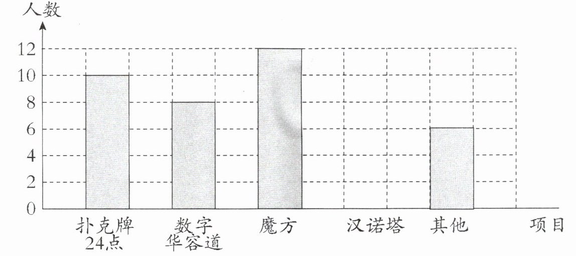 (2)在统计图魔方对应的直条上画到12的位置,汉诺塔对应的直条上画到9的位置,其他对应的直条上画到6的位置。