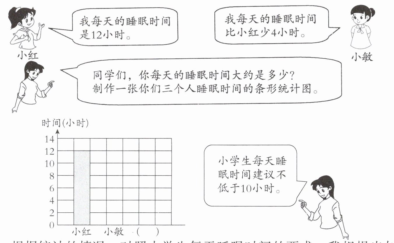 1. 小敏每天睡眠时间:$12 - 4 = 8$(小时),根据三人睡眠时间,假设第三个人(图中括号处)睡眠时间为10小时(合理假设值),绘制条形统计图如下(每个格代表2小时,用涂色表示):