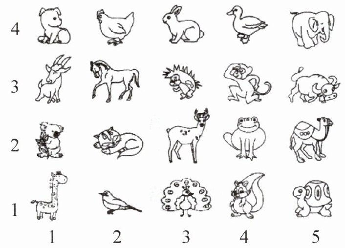 (2) 圈出第1行所有物品(长颈鹿、鸟、孔雀、松鼠、乌龟)